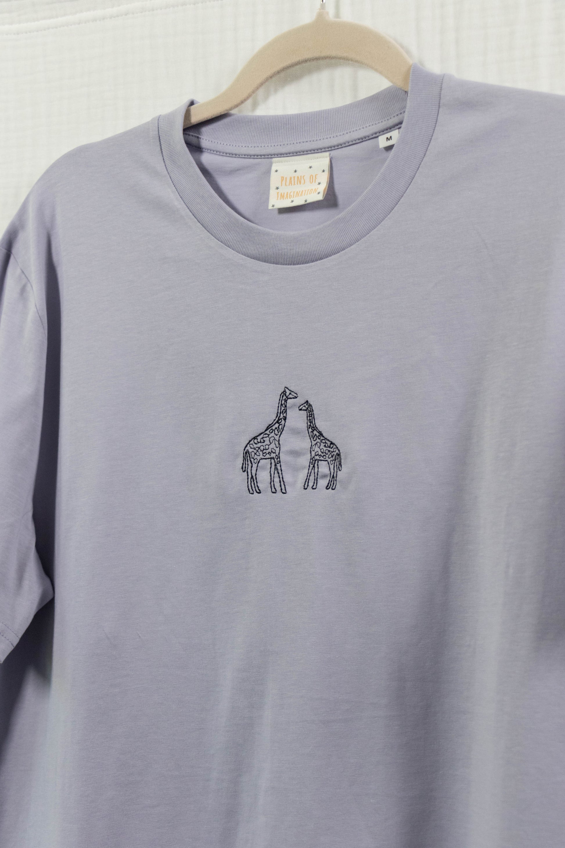 Machine embroidered giraffes on a adults unisex t-shirt.