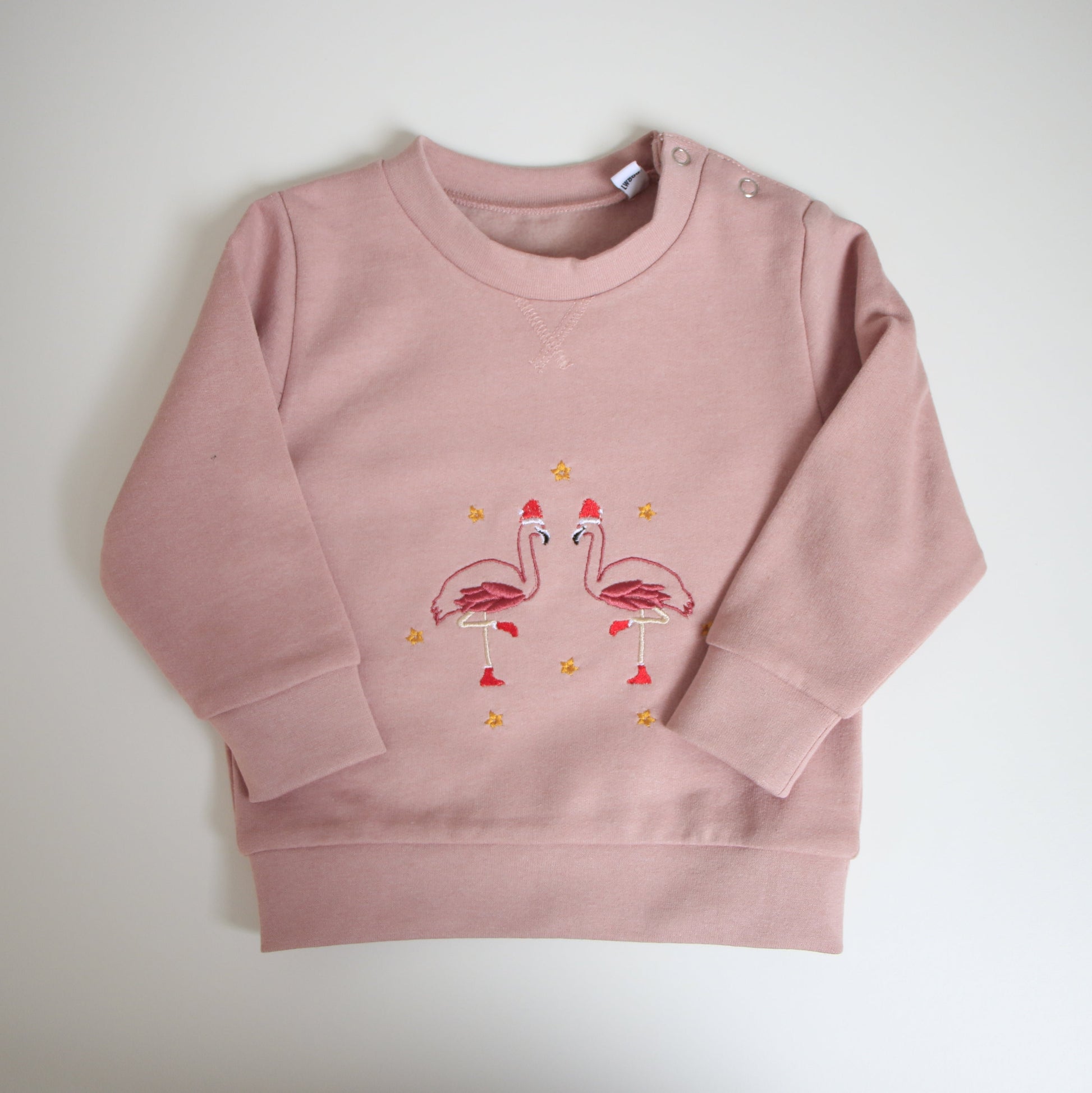Machine embroidered festive flamingos on a 6-12 Month sweater