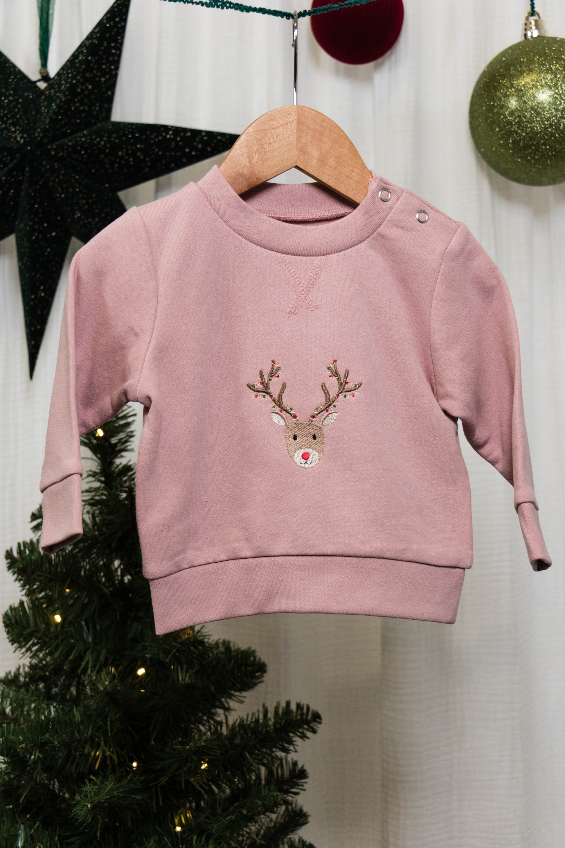 Machine embroidered reindeer on a baby sweater with matching joggers