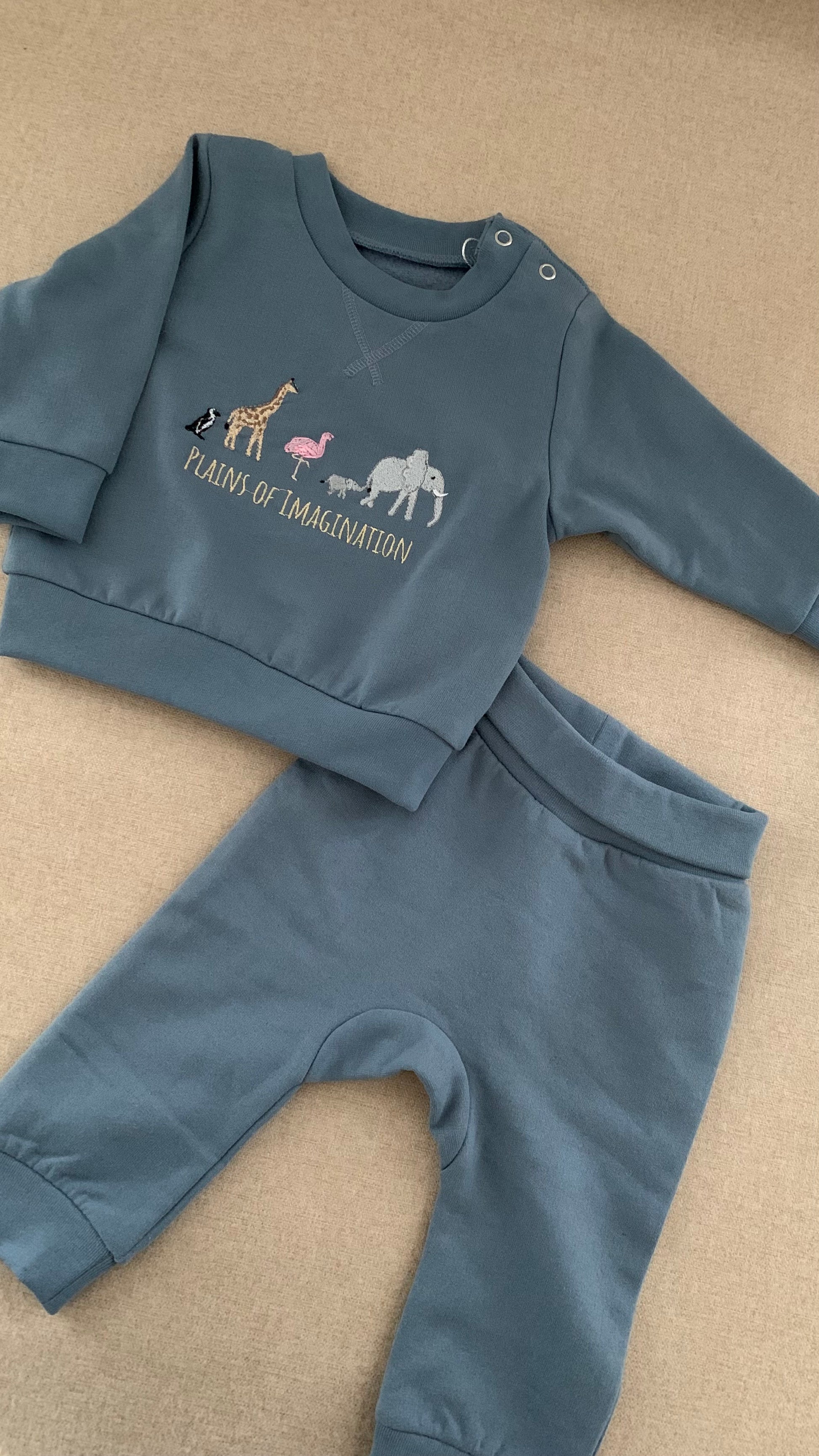 Machine embroidered safari parade design on a baby sweater with matching joggers
