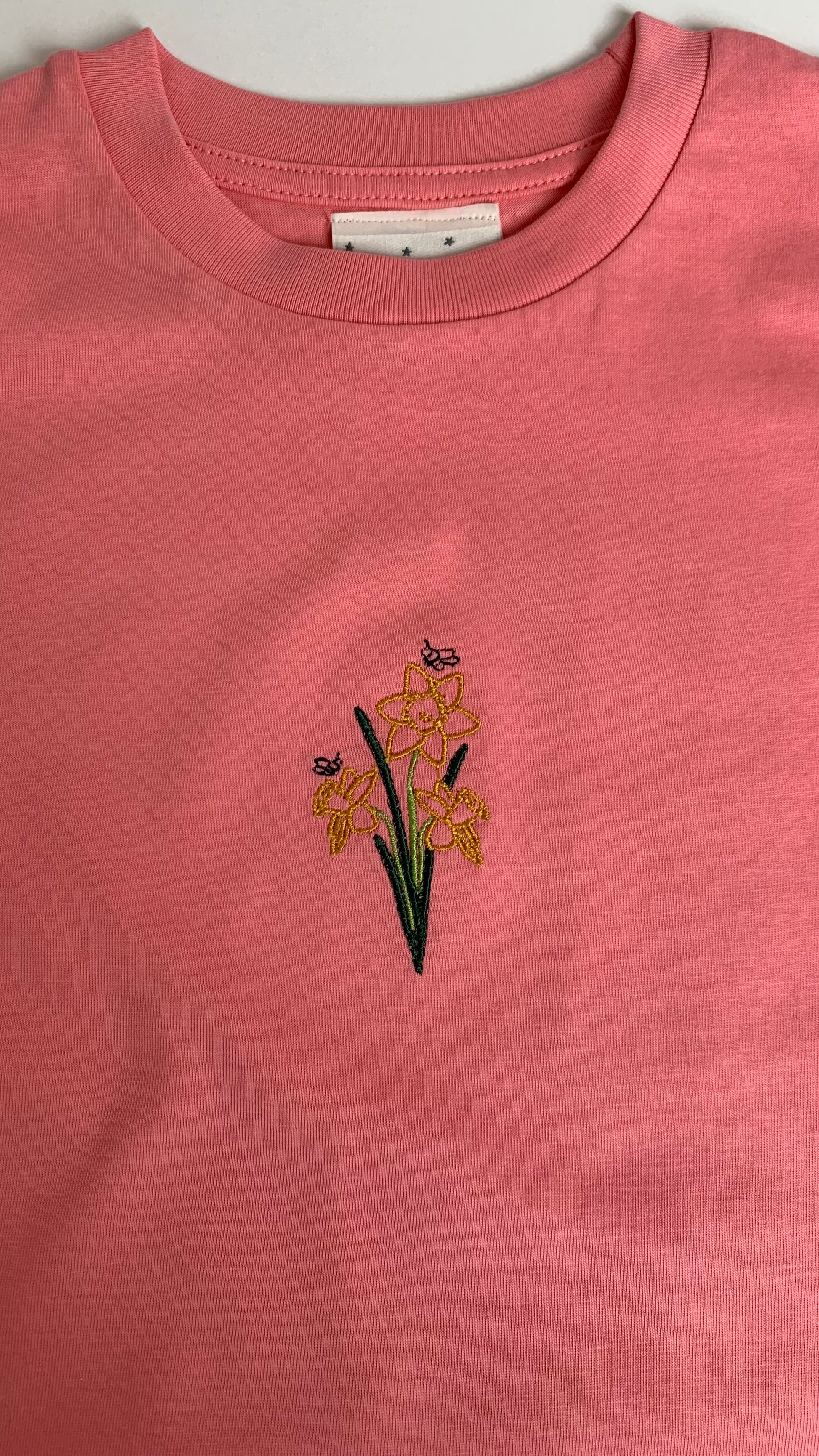 Machine embroidered daffodil bunch on a childrens unisex t-shirt.